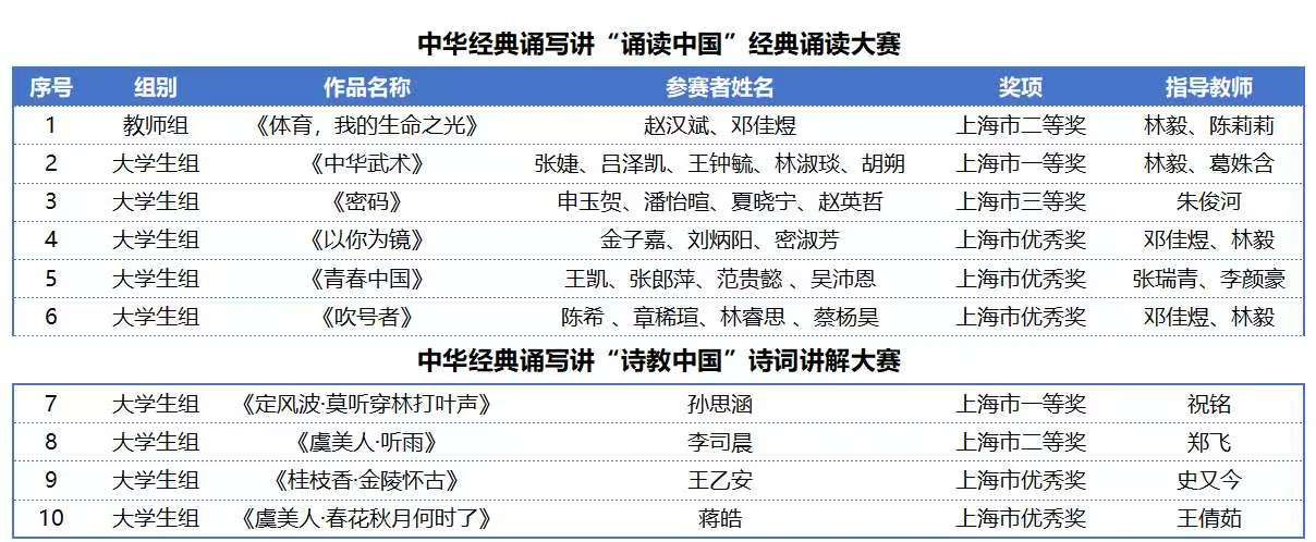 此外,大学生组作品《虞美人·听雨》获得上海市二等奖,《密码》获得上海市三等奖,《桂枝香·金陵怀古》《虞美人·春花秋月何时了》《青春中国》《吹号者》《以你为镜》获上海市优秀奖,这些作品从不同角度展现了我校学子对经典文化的独特理解和现代解读。